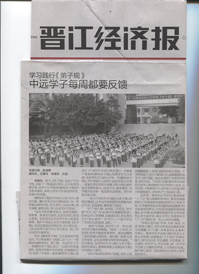 如今,《弟子規(guī)》走進了不少學校,刮起了一陣重溫經(jīng)典風。去年秋季學期開始,泉州中遠學校將《解悟弟子規(guī)》作為校本課程,重視引導學生傳承國學經(jīng)典,弘揚中華美德。     《解悟弟子規(guī)》由學校辦公室主任王重尚主編。翻開這本古色古香的讀本,每一學時都由德育目標、經(jīng)文原句、詞語詮釋、圖文易解、案例呈現(xiàn)、凈心反思等環(huán)節(jié)組成。     “這本書很有教育意義,里面有漫畫、有故事。故事有正面的,也有反面的;有名人故事,也有發(fā)生在中遠學子身上的真實案例。我們不再是人云亦云地背誦《弟子規(guī)》,而是邊誦讀邊對照反思,在日常生活、人際交往等方面中可以學以致用。”初三年(5)班學生姚青說。     目前,《解悟弟子規(guī)》正在該校初中部試點,今后將逐漸擴大輻射,而“七個一”的做法也頗具特色。據(jù)了解,中遠學生人手一本《解悟弟子規(guī)》;成立一支國學經(jīng)典誦讀隊,每周定時集中培訓演練,拓展輻射空間;每周三早讀統(tǒng)一誦讀《解悟弟子規(guī)》;每周五下午放學以年段為單位進行一次集體廣場誦讀《解悟弟子規(guī)》;每周末學生以背誦、講述等形式與家長共享一節(jié)《解悟弟子規(guī)》,并付諸踐行;每周日返校各班主任統(tǒng)一收集反饋表及相關視頻、照片材料;德育處負責擇優(yōu)展示,促進共享,推進落實,每學期評選表彰一批星級先進典型,并作經(jīng)驗交流介紹。     一張小小的《學習與踐行<弟子規(guī)>簡明反饋表》,讓中遠學校的國學經(jīng)典教育貼近生活,走進家庭,瞬間有了活力。     學了“借人物,及時還。后有急,借不難”經(jīng)文,初二年(6)班學生林毓欽知道了即使是再小的事情,也要講信用。其父林先生在“家長意見”一欄寫下——“孩子學會了有借有還的道理,很好。”     讀到“兄弟睦,孝在中”,初一年(3)班學生冉文靜有些慚愧。“我有一個弟弟,以前我們經(jīng)常為做家務事爭吵,現(xiàn)在我懂得了姐姐要謙讓著弟弟,我們要一起幫父母分擔家務,這也是孝敬父母的具體表現(xiàn)。”冉文靜說,每周的《學習與踐行<弟子規(guī)>簡明反饋表》,都督促著她去實踐《弟子規(guī)》中的做法與要求。      “《弟子規(guī)》看似簡單不顯眼,實際上里面蘊藏著做人、做事、做好學問的大智慧。中學階段是人生的關鍵轉折點,如果能很好地學習《弟子規(guī)》,相信未來的人生將更有智慧,更有前途。”北京東方國際教育研究院副院長張秀云教授勉勵中遠學校努力追求、認真實踐,不斷提高學生對傳統(tǒng)文化的接受能力和感悟能力,養(yǎng)浩然正氣,塑高尚人格。     近年來,泉州中遠學校先后獲得國家“十二五”重點課題科研單位、教育部福建師范大學基礎教育課程研究中心實驗學校、中央教科所《中華民族傳統(tǒng)美德教育》實驗基地等稱號。今年4月份該校申報的課題《<弟子規(guī)>校本課程資源開發(fā)與利用研究》,經(jīng)專家評審,確認為晉江市教育科學“十三五”規(guī)劃(第一批)立項研究課題。     “學校注重實施‘傳承、創(chuàng)新、綠色、共享’的育人模式,有針對性地汲取儒家思想文化精髓,以‘八德’(孝悌忠信禮義廉恥)為核心,教育學生學會深入踐行社會主義核心價值觀,有效推進‘六個學會’的深化踐行,即學會行孝、學會感恩、學會尊重、學會誠信,學會學習,學會發(fā)展,進一步引導學生樹立正確的世界觀、人生觀和價值觀,提升核心素養(yǎng)。”黃金盾校長在接受記者采訪時表示。