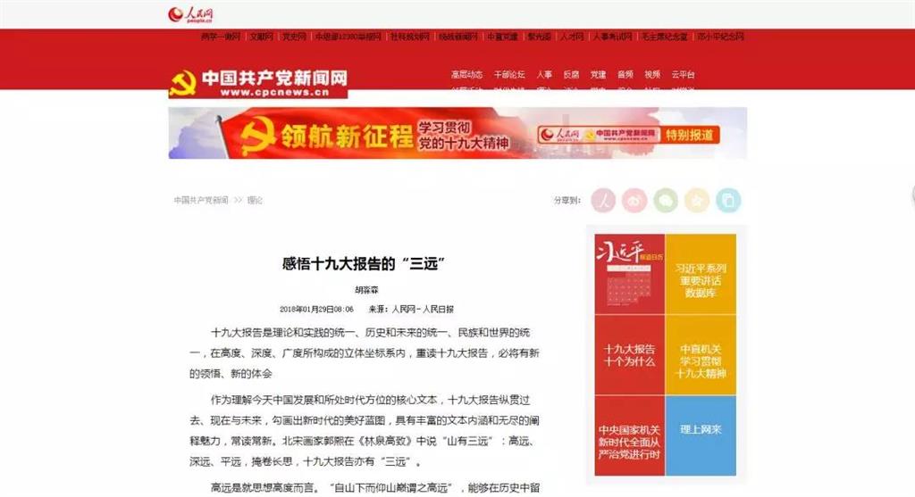 近日,人民網(wǎng)-人民日?qǐng)?bào)發(fā)布了一篇文章《感悟十九大報(bào)告的“三遠(yuǎn)”》,以“高遠(yuǎn)”決定高度,“深遠(yuǎn)”意味深度,“平遠(yuǎn)”代表廣度,論證十九大報(bào)告中的“三遠(yuǎn)”。