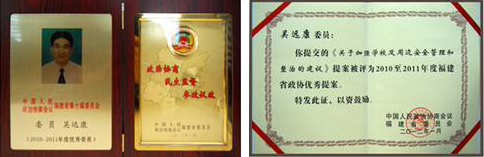 2012年1月15日,在福建省政協(xié)十屆五次會(huì)議上,三遠(yuǎn)集團(tuán)董事長(zhǎng)、總裁吳遠(yuǎn)康委員當(dāng)選“2010-2011年度福建省政協(xié)優(yōu)秀委員”,其提交的《關(guān)于加強(qiáng)學(xué)校及周邊安全管理和整治的建議》榮獲2010-2011年度福建省政協(xié)優(yōu)秀提案。 長(zhǎng)期以來,擔(dān)任福建省政協(xié)僑聯(lián)界委員的集團(tuán)董事長(zhǎng)、總裁吳遠(yuǎn)康先生,積極貫徹省委、省政府《關(guān)于進(jìn)一步加強(qiáng)和改進(jìn)新形勢(shì)下僑聯(lián)工作的意見》等文件精神,認(rèn)真履行政協(xié)委員職能,大力推進(jìn)省政協(xié)關(guān)于政治協(xié)商、民主監(jiān)督、參政議政職能的制度化、規(guī)范化、程序化建設(shè),為凝聚僑心、匯集僑智、發(fā)揮僑力、維護(hù)僑益等各項(xiàng)工作的有利開展做出了突出貢獻(xiàn)。 集團(tuán)董事長(zhǎng)、總裁吳遠(yuǎn)康先生當(dāng)選2010-2011年度福建省政協(xié)優(yōu)秀委員,其《關(guān)于加強(qiáng)學(xué)校及周邊安全管理和整治的建議》榮獲2010-2011年度福建省政協(xié)優(yōu)秀提案